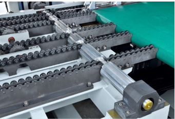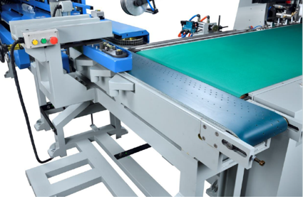 Przenośnik z otworami zapewnia stabilny transport drewna, które nie pozostaje na blacie. Przenośnik narożny musi być połączony z systemem odpylania.
