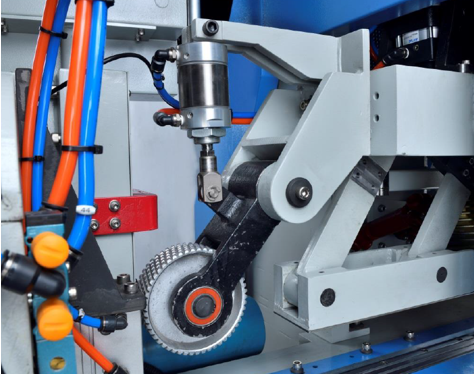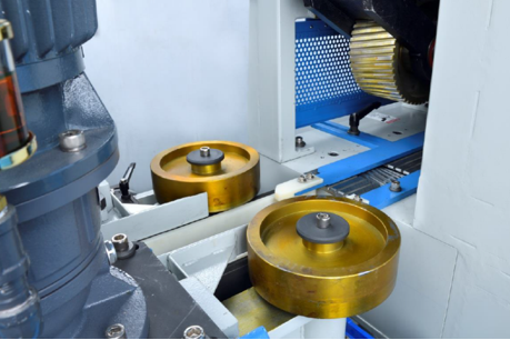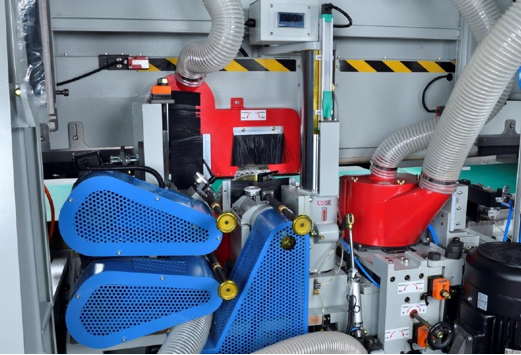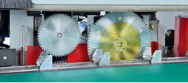Pozioma maszyna do łączenia na złącza wpustowe posiada specjalne przednie koła podające, które umieszczają drewno w prawidłowej pozycji.